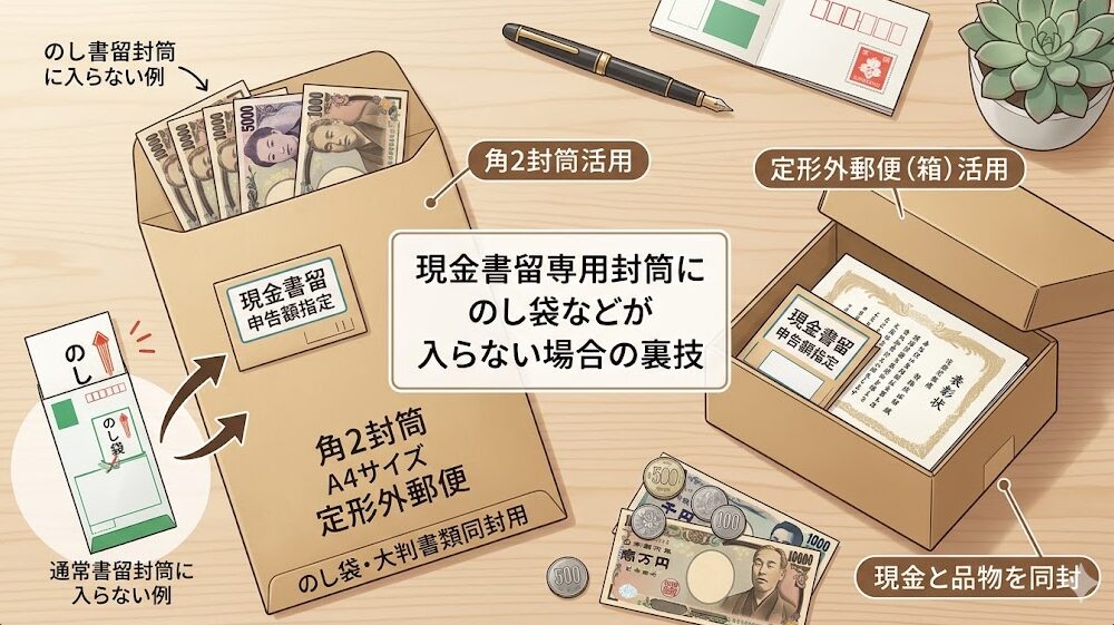 なお、現在郵便局で販売されている専用封筒のサイズ展開は、この「1種類のみ」です。大・中・小といったバリエーションはありません。では、もしこの改良されたサイズでも入らないような、巨大なご祝儀袋や、現金と一緒にちょっとした分厚いプレゼントを送りたい場合はどうすればいいのでしょうか?その答えこそが、次の章で詳しく解説する「究極の裏技」なのです。