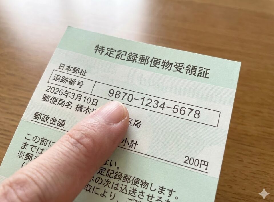 郵便局の窓口で「特定記録」で出すと、レシートのような紙と一緒に「受領証(お客様控え)」がもらえます。そこに記載されている「お問い合わせ番号(追跡番号)」が、あなたの精神安定剤になります。