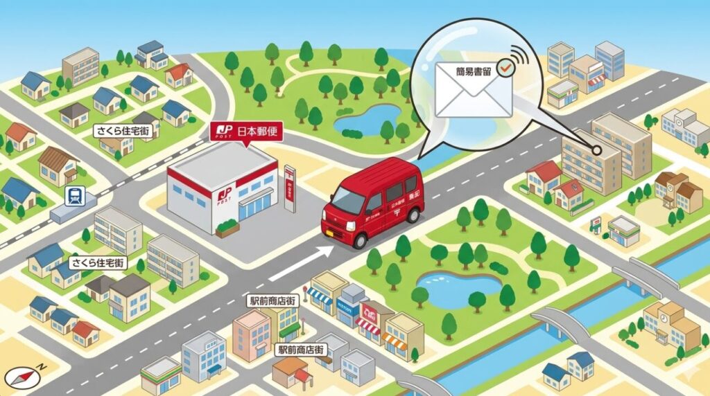 街にある小さな郵便局(特定郵便局)で差し出した簡易書留は、夕方頃に集荷のトラックが来るまで、その郵便局の奥の部屋で待機しています。トラックは複数の小さな局を回りながら、最終的に地域の巨大なハブ局(地域区分局)へと郵便物を運び込み、そこで初めて本格的な仕分けと他県への発送作業が始まります。