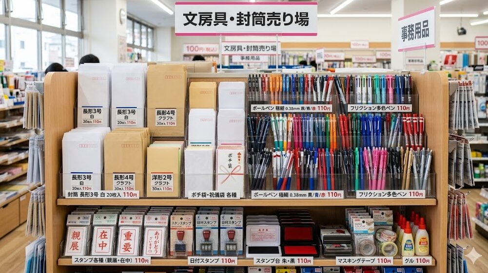 コンビニでは手に入りにくい親展関連のアイテムですが、ダイソー、セリア、キャンドゥといった100円ショップ(100均)の大型店舗に行けば、驚くほど充実したラインナップが揃っています。もし郵送までに少し時間の余裕がある場合や、今後も親展書類を送る機会が複数回あると予想される場合は、事前に100均でアイテムを調達しておくのが最もコストパフォーマンスが良く、賢い選択と言えます。
