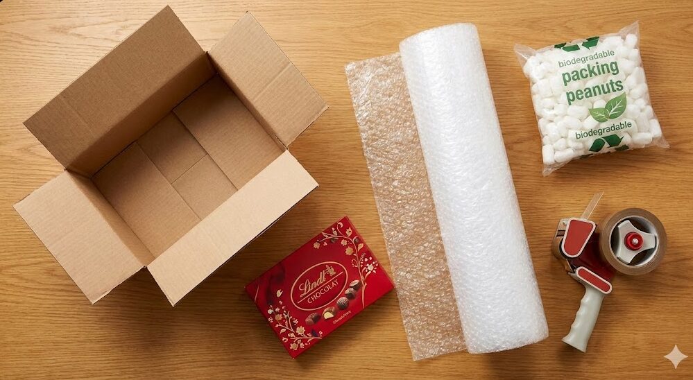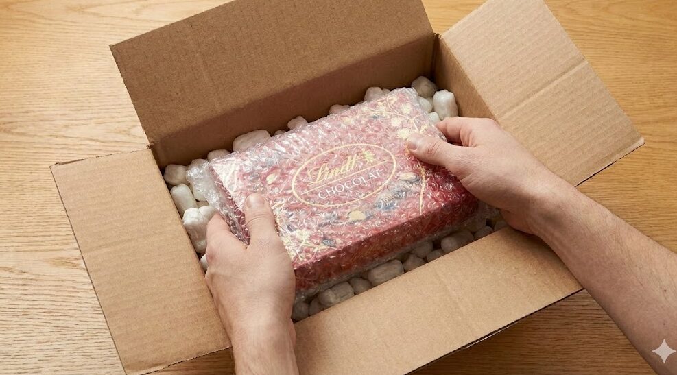 配送用ダンボールは、ギフトボックスにジャストサイズすぎるものより、少し余裕があるものを選び、緩衝材をたっぷり入れる方が衝撃を吸収してくれます。「過剰かな?」と思うくらいの梱包が、郵送バレンタインでは正解なのです。