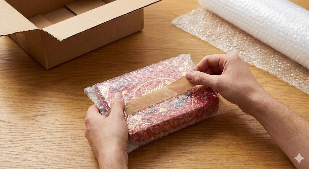 - プチプチ(緩衝材)の巻き方:ギフトボックスをプチプチで包みます。この時、テープでガチガチに止めるのではなく、ふんわりと、でも角がしっかり守られるように2重、3重に巻くのがコツです。